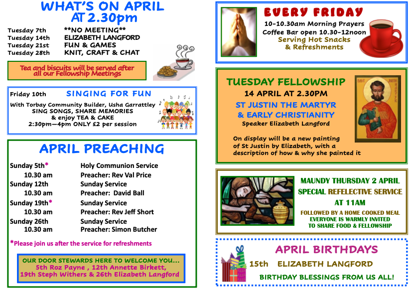 Everyone is invited each Monday morning to join the Torbay Circuit telephone prayer group. Rev'd Jeff Short leads us and there are opportunities to offer your own prayers.