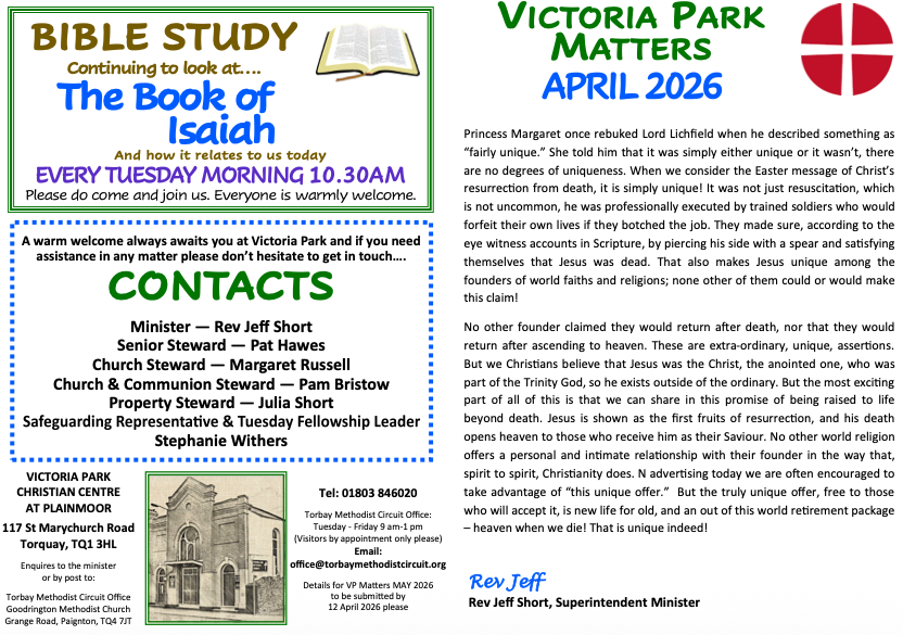 Welcome to Victoria Park Christian Centre, located in the heart of Plainmoor, Torquay. Though one of the smaller churches in the circuit, it has a big heart, filled with warmth, love, and a deep sense of community. Our church is a place where everyone is welcomed, valued, and encouraged to grow in their faith journey. With spirit of generisiy and service, we come together worship, support one another, and reach out to our wider community through different events such as weekly coffee mornings. Whether you're a visitor or looking for a church to call home, we invite you to join us and experience the heartfelt welcome that makes Victoria Park so special.